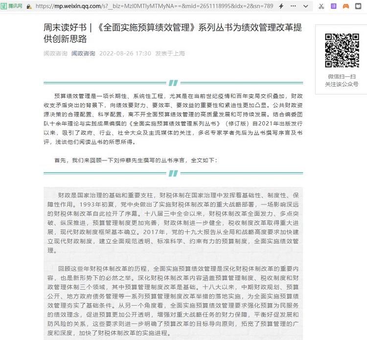 赵敏:周末读好书 | 《全面实施预算绩效管理》系列丛书为绩效管理改革提供创新思路【2022年8月26日,闻政咨询】