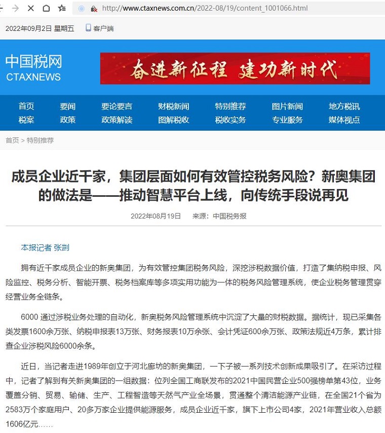 成员企业近千家,集团层面如何有效管控税务风险?新奥集团的做法是——推动智慧平台上线,向传统手段说再见【2022年8月19日,中国税务报】