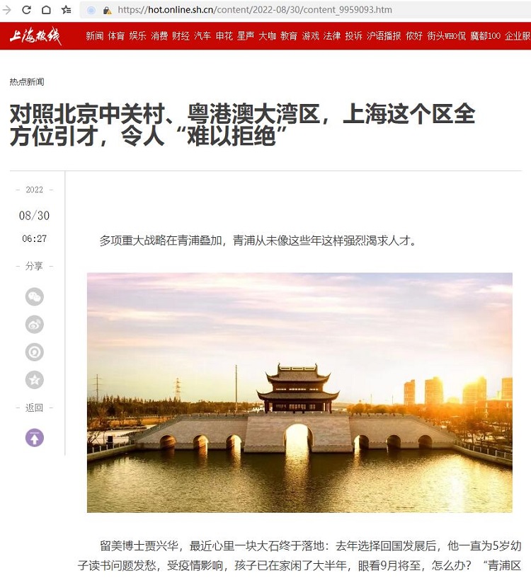 对照北京中关村、粤港澳大湾区,上海这个区全方位引才,令人“难以拒绝”【2022年8月29日,上海热线】