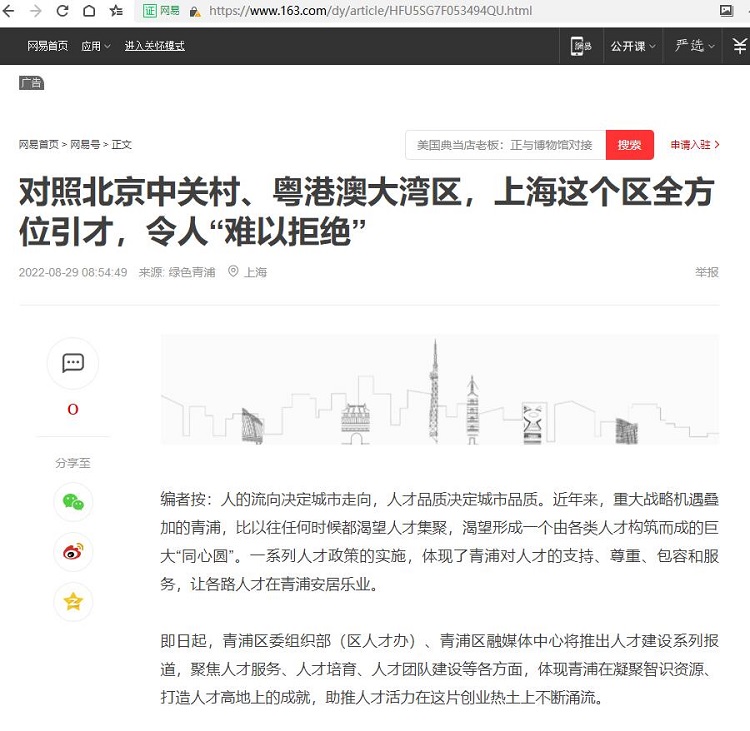 对照北京中关村、粤港澳大湾区,上海这个区全方位引才,令人“难以拒绝”【2022年8月29日,网易】