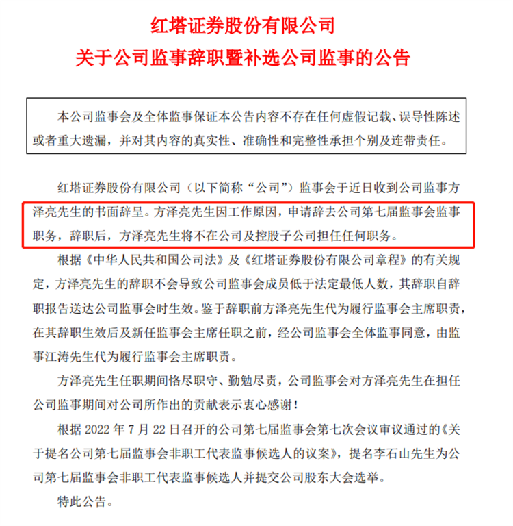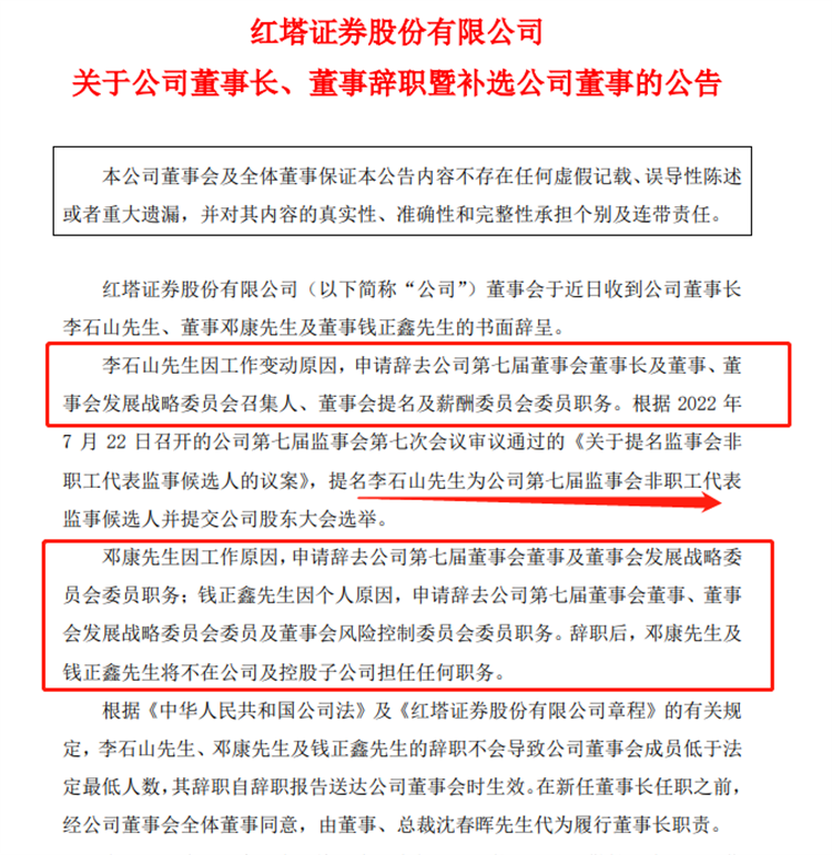 今年7月22日,红塔证券宣布4名高管离职,董事长李石山因工作变动辞去董事长及董事等职务,自8月18日起正式履行该公司监事、监事会主席职责;董事邓康也由于工作原因,辞去董事及董事会发展战略委员会委员职务;董事钱正鑫因个人原因,辞去董事等职务,邓康、钱正鑫均不再担任公司及控股子公司任何职务。此外,红塔证券监事方泽亮因工作原因辞去监事职务,不再担任公司及控股子公司任何职务。