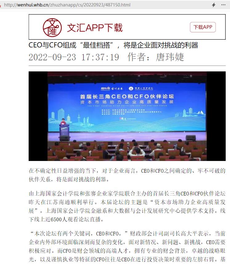 由上海国家会计学院和张謇企业家学院联合主办的首届长三角CEO和CFO伙伴论坛昨天在江苏南通顺利举行。本届论坛的主题是“资本市场助力企业高质量发展”。上海国家会计学院金融系和大数据与会计发展研究中心提供学术支持。线下线上近6500人观看论坛直播。