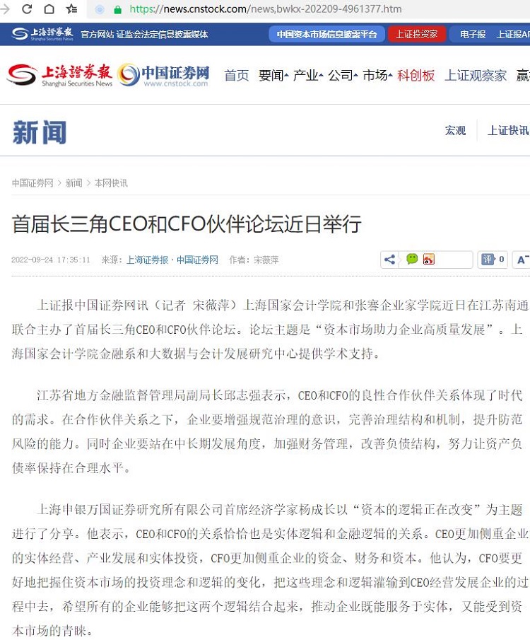 首届长三角CEO和CFO伙伴论坛近日举行【2022年9月24日,上海证券报】