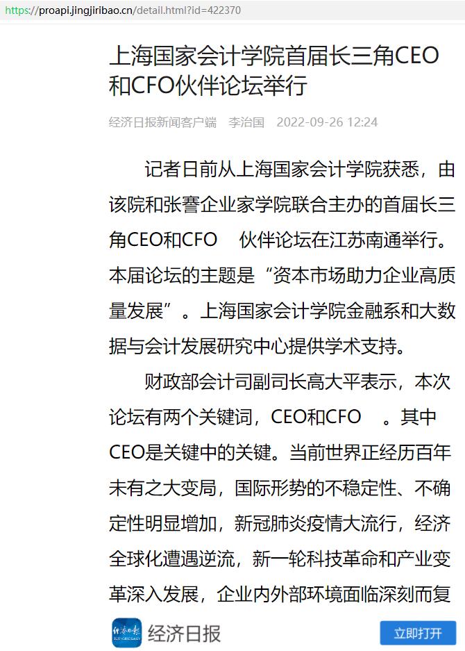 上海国家会计学院首届长三角CEO和CFO伙伴论坛举行【2022年9月26日,经济日报】