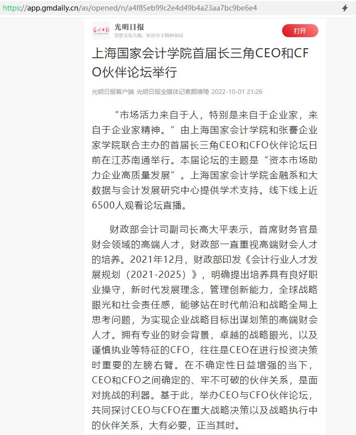 上海国家会计学院首届长三角CEO和CFO伙伴论坛举行【2022年10月1日,光明日报】