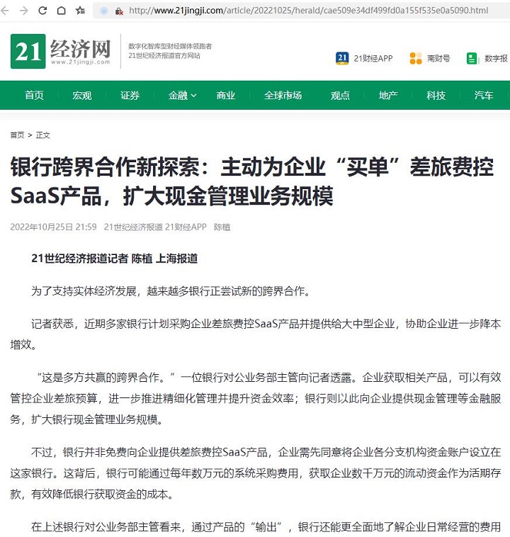 袁敏:银行跨界合作新探索:主动为企业“买单”差旅费控SaaS产品,扩大现金管理业务规模【2022年10月25日,21世纪经济报道】