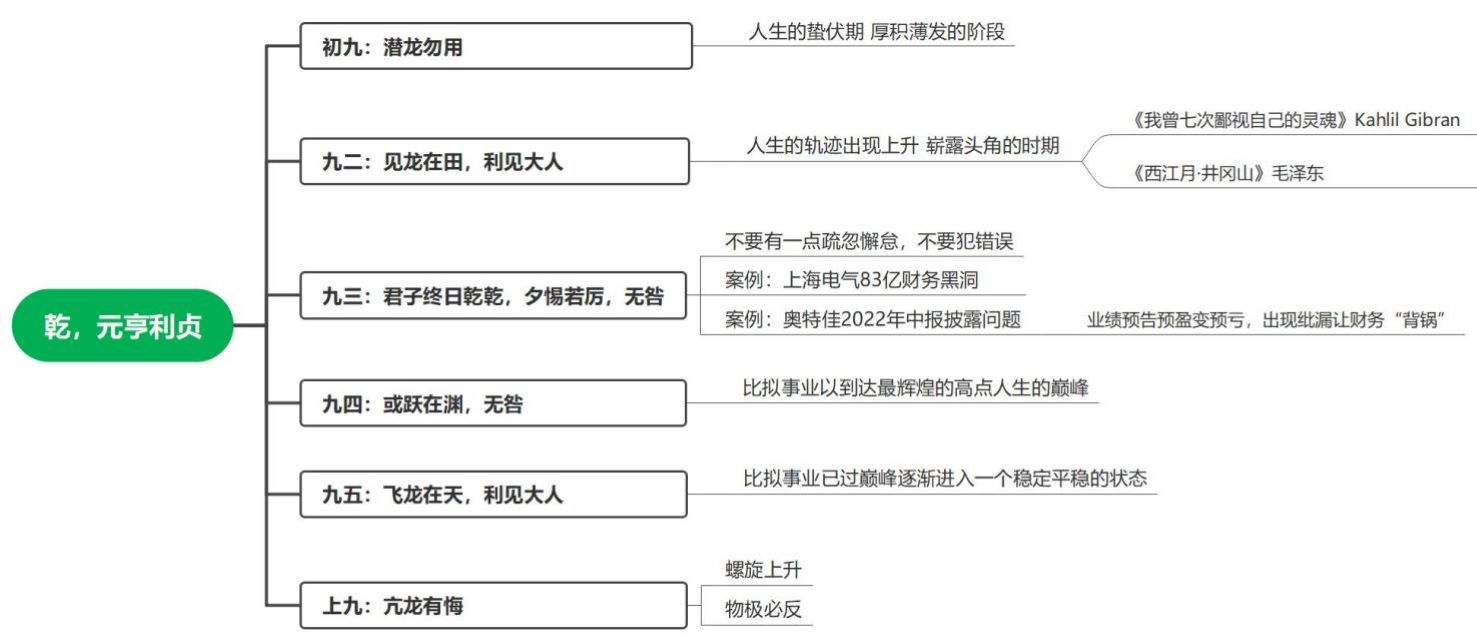 《周易》入门大概都会提及乾卦,乾为天,乾,元亨利贞。它的六个爻辞也阐述了事物发展的规律,可以从短期和长期的两个角度去理解。