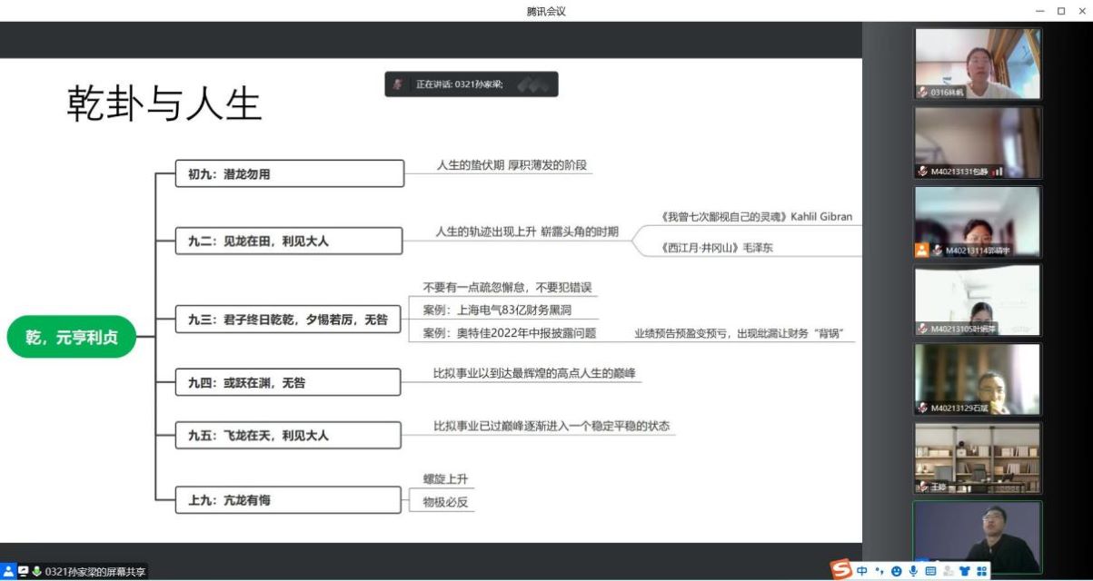 (撰稿:孙家梁/摄影:孙家梁)读书破万卷,下笔如有神。我院每位非全日制研究生在院读书期间将与同学们做至少一次读书分享会,旨在为分享者搭建平台分享书籍,让参与者开拓眼界、思想共鸣。2022年10月15日第25期读书分享会由2021级非全日制会计班孙家梁同学分享《周易》。