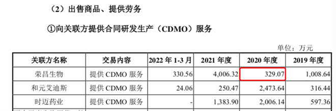 迈百瑞披露2020年向荣昌生物销售数据为329.07万元,来源:迈百瑞招股书