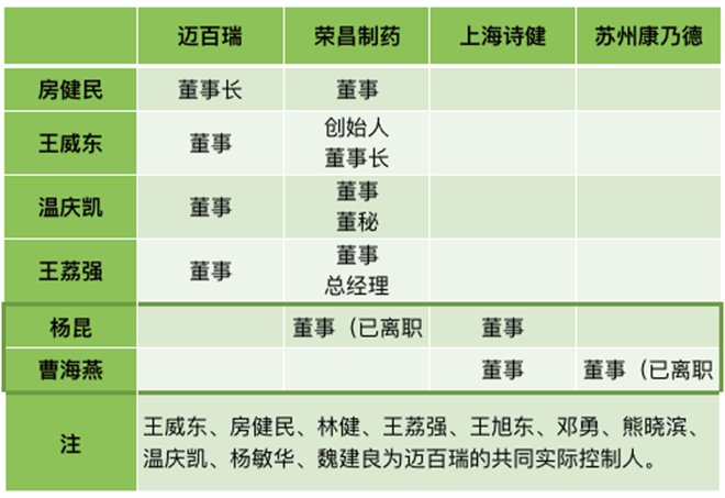 或基于此,荣昌制药与迈百瑞董监高关系十分紧密。迈百瑞董事长房健民及其配偶陶鲁群担任荣昌制药董事;迈百瑞董事王威东,为荣昌制药创始人、董事长。迈百瑞董事温庆凯最初2004年开始任荣昌制药副总裁,现为荣昌制药董事兼董秘。