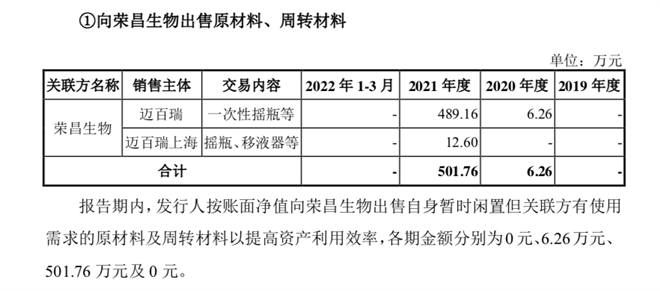 2021年,向荣昌生物出售501万元原材料等,来源:迈百瑞招股书