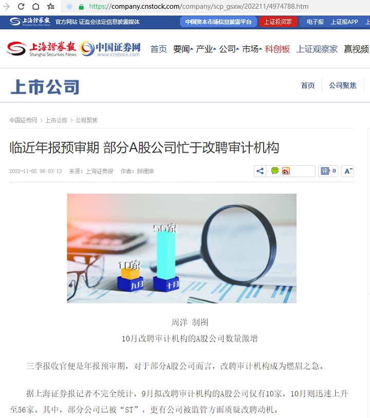 叶小杰:临近年报预审期 部分A股公司忙于改聘审计机构【2022年11月2日,上海证券报】