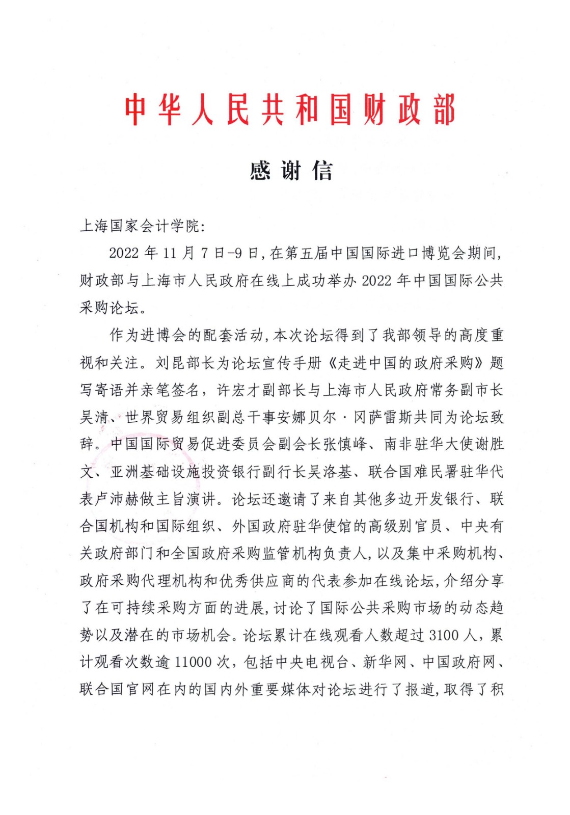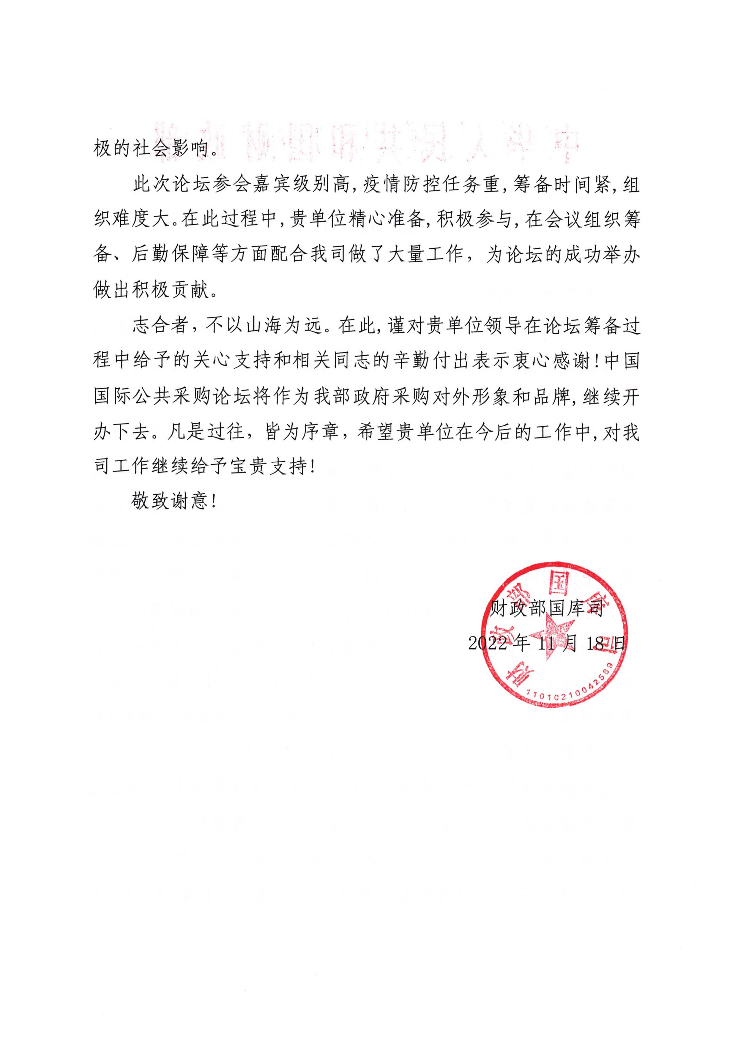 财政部国库司发来感谢信