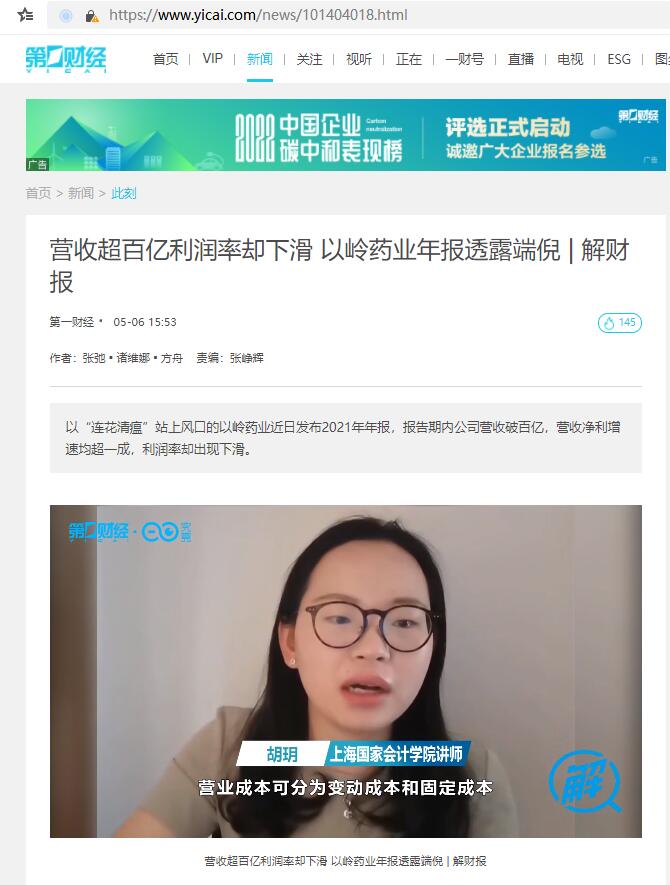 胡玥:营收超百亿利润率却下滑 以岭药业年报透露端倪 | 解财报【2022年5月6日,第一财经电视台】