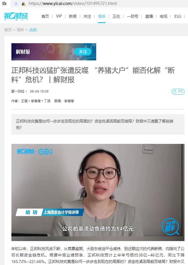 胡玥:正邦科技凶猛扩张遭反噬 “养猪大户”能否化解“断料”危机?丨解财报【2022年8月4日,第一财经电视台】