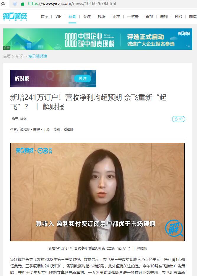 杨伽伦:新增241万订户!营收净利均超预期 奈飞重新“起飞”? ︱ 解财报【2022年11月22日,第一财经电视台】