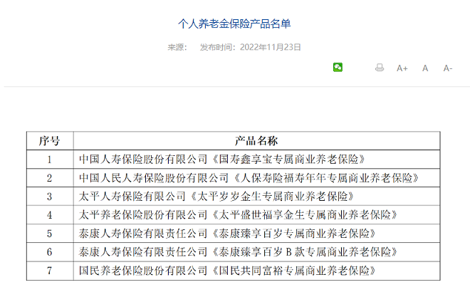 11月23日,中国银保信官网公布首批个人养老金保险产品名单,共计7只,为专属商业养老保险产品。公募基金方面,129只个人养老基金等待上线,14家券商入选首批个人养老金基金销售机构名录。