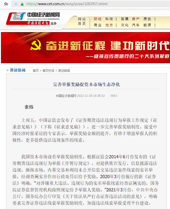 叶小杰:完善举报奖励促资本市场生态净化【2022年11月21日,中国经济时报】