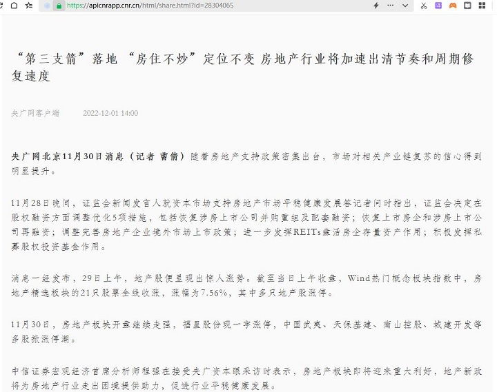 叶小杰:“第三支箭”落地 “房住不炒”定位不变 房地产行业将加速出清节奏和周期修复速度【2022年12月1日,央广网】