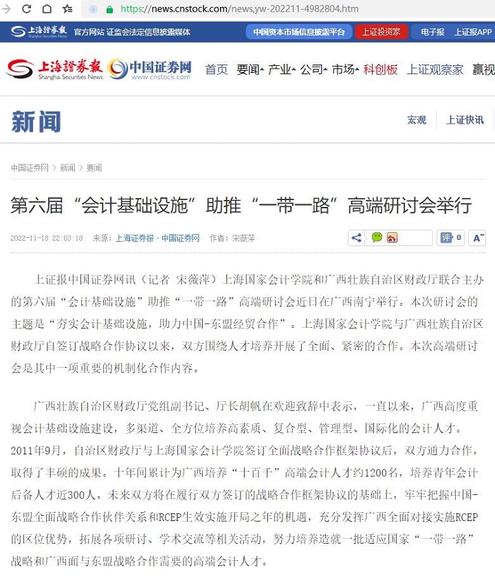 第六届“会计基础设施”助推“一带一路”高端研讨会举行【2022年11月18日,上海证券报】