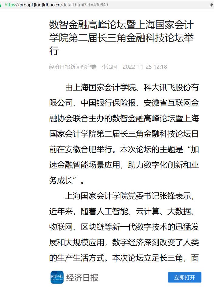 数智金融高峰论坛暨上海国家会计学院第二届长三角金融科技论坛举行【2022年11月25日,经济日报】