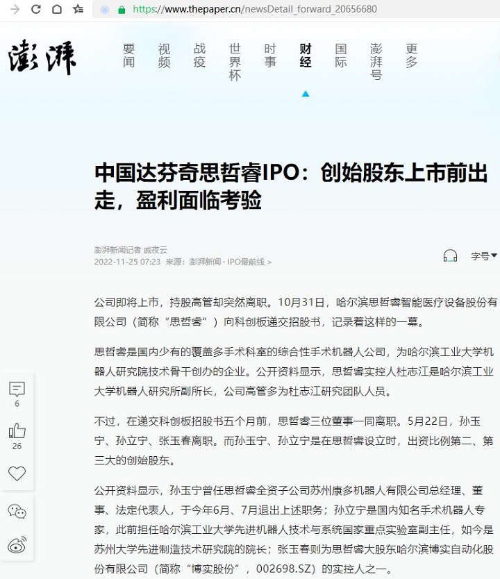 袁敏:中国达芬奇思哲睿IPO:创始股东上市前出走,盈利面临考验【2022年11月25日,澎湃新闻】