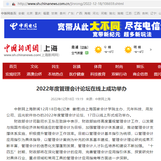 中新网上海新闻12月18日电(记者 姜煜)由上海国家会计学院主办,元年科技、用友公司、远光软件协办的2022年度管理会计论坛,17日以线上形式成功举办。