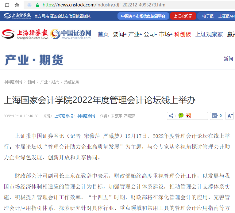 上海国家会计学院2022年度管理会计论坛线上举办【2022年12月18日,上海证券报】