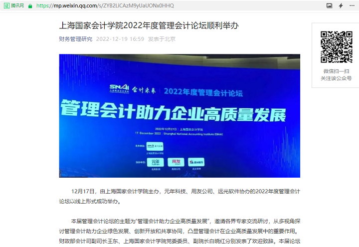12月17日,由上海国家会计学院主办,元年科技、用友公司、远光软件协办的2022年度管理会计论坛以线上形式成功举办。