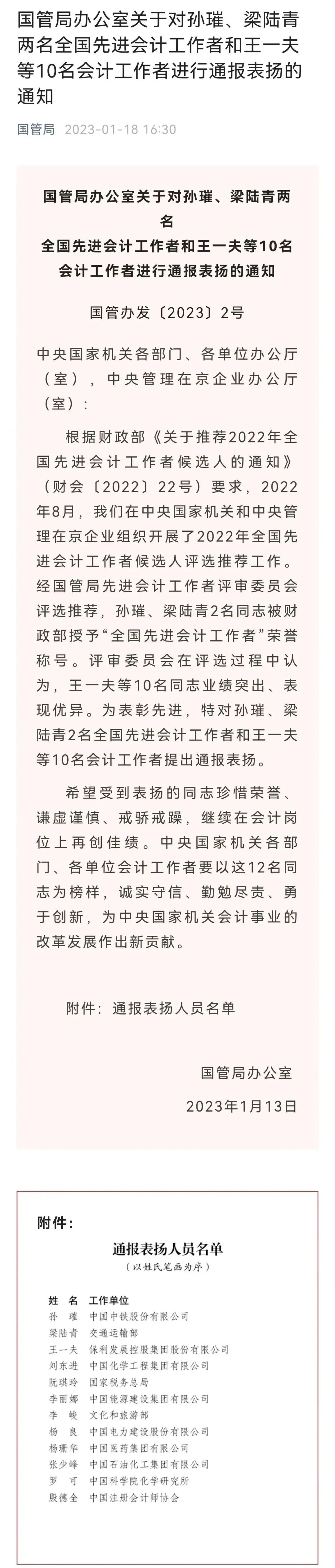 根据国管局官微2023年1月18日的发文,我院孙璀校友荣获“全国先进会计工作者”称号,刘东进、张少峰校友获通报表扬。