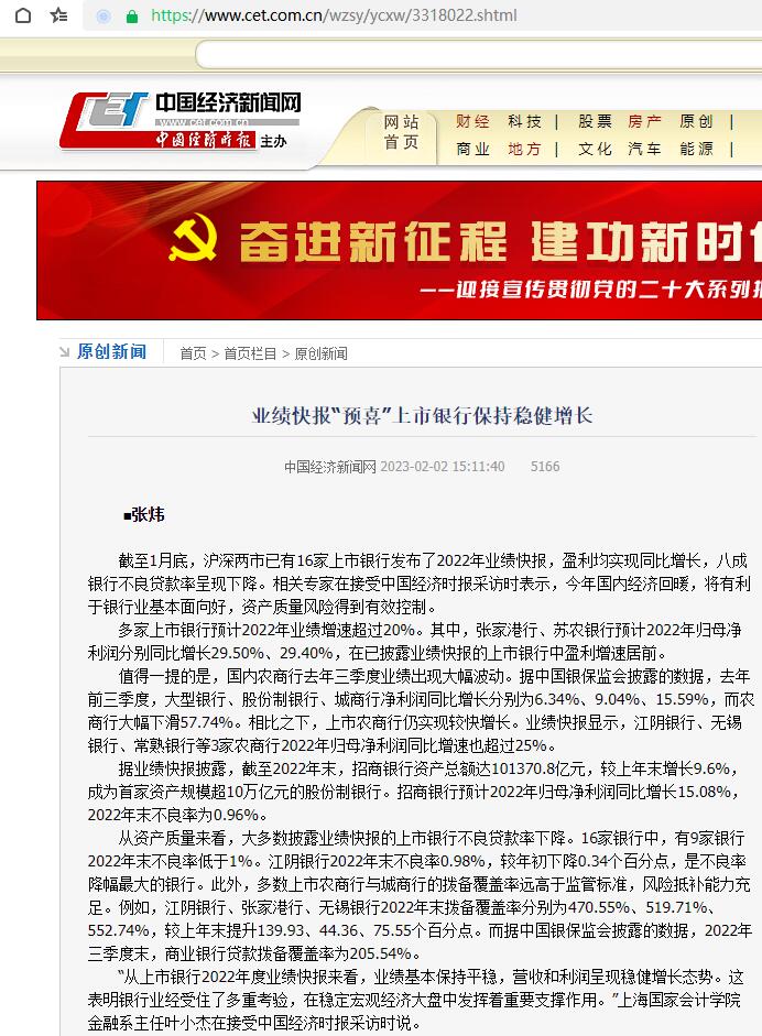 叶小杰:业绩快报“预喜”上市银行保持稳健增长【2023年2月2日,中国经济时报】