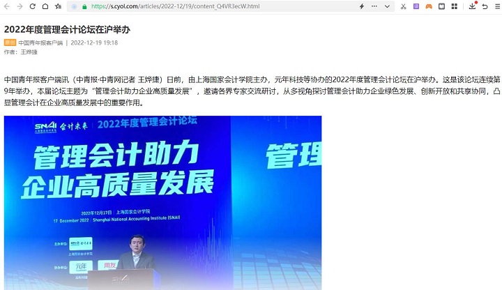 2022年度管理会计论坛在沪举办【2022年12月19日,中国青年报】