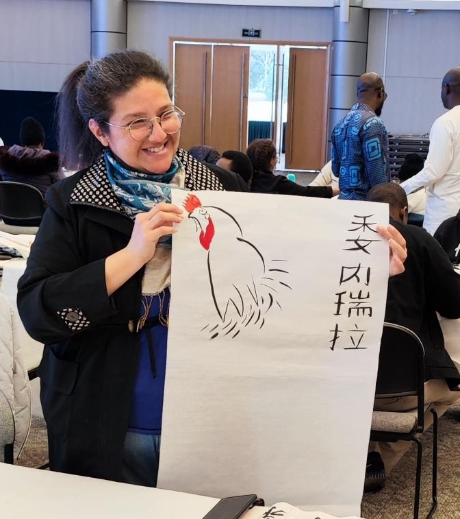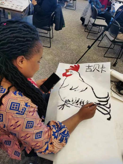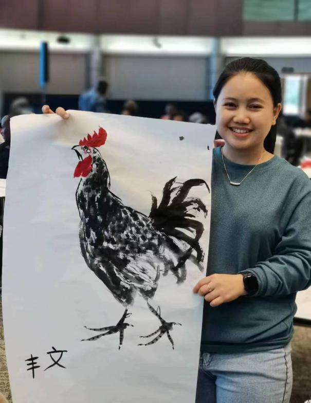 学画雄鸡则是大家最为期待的环节。王老师以墨汁、清水和两种颜料,寥寥数笔就将不同形态的雄鸡勾勒得惟妙惟肖、栩栩如生,令大家叹为观止。留学生们学习热情非常高涨,在老师的带领下体验墨与彩的碰撞,水与纸的融合,在紧张和兴奋之间创作出一幅又一幅各具特色的雄鸡图。