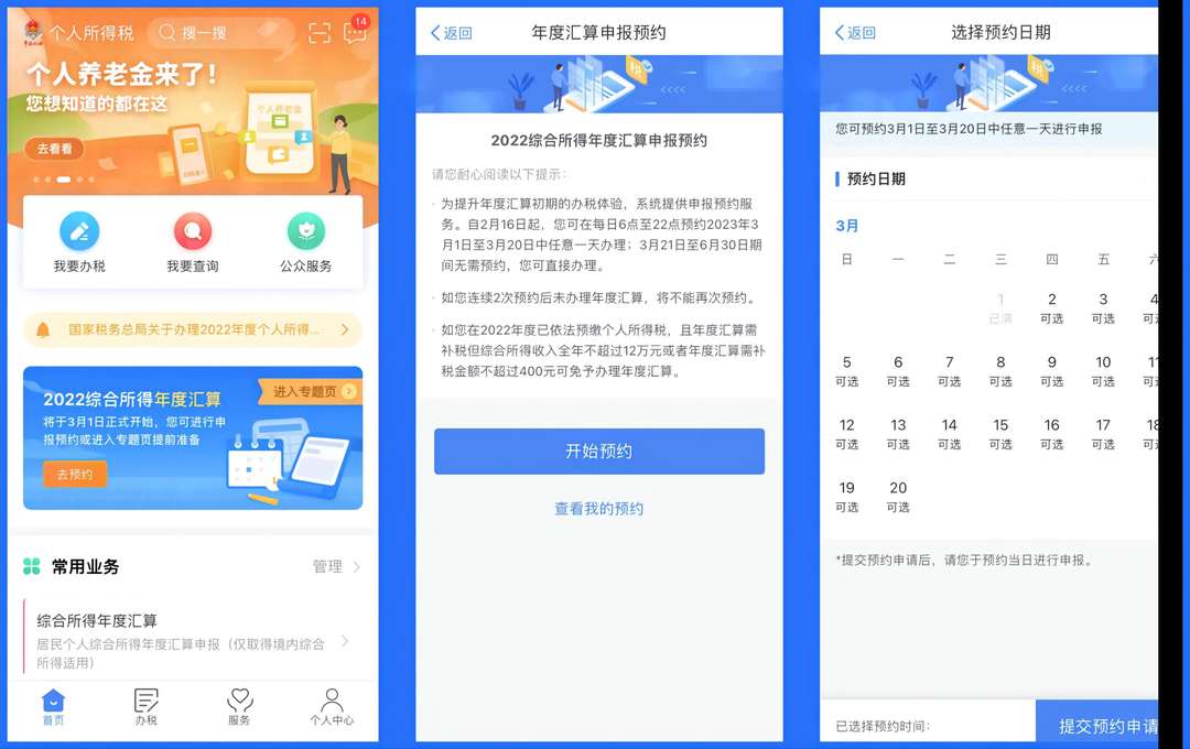 相比去年,今年个税汇算清缴的最后预约日从3月15号延长到了3月20号,也就是说在3月20号之前要办理个税汇算清缴的话,必须通过个税APP预约办理。3月20号以后则可以随时办理。