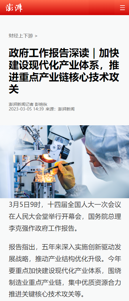 专家观点:钟世虎 | 澎湃新闻:政府工作报告深读|加快建设现代化产业体系,推进重点产业链核心技术攻关 【2023年3月5日】