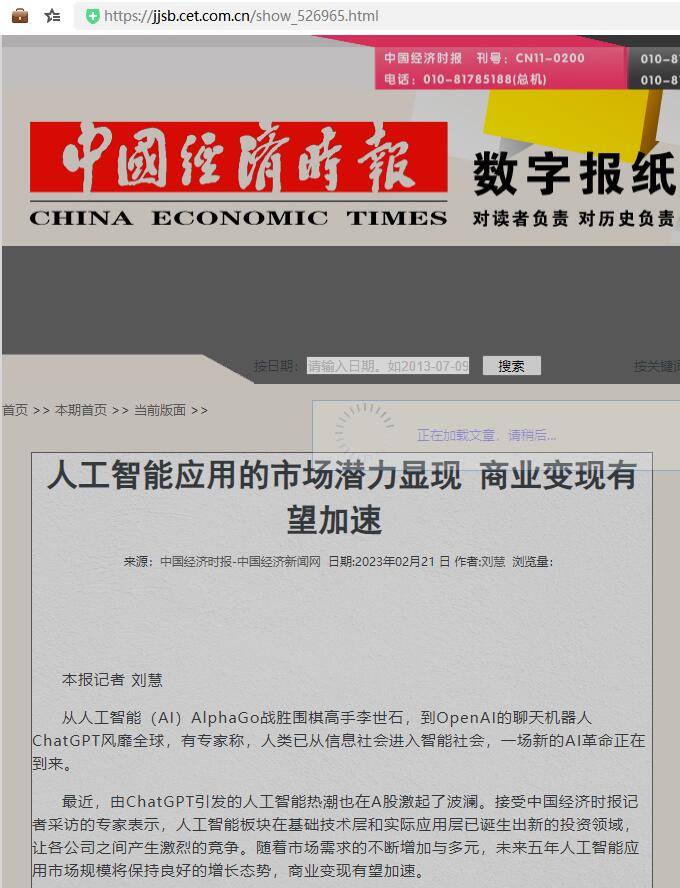 专家观点:马长峰 | 中国经济时报:资本市场 | 人工智能应用的市场潜力显现 商业变现有望加速【2023年2月21日】