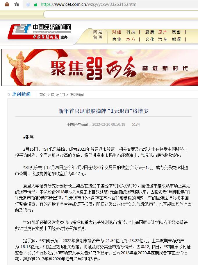 专家观点:钟世虎 | 中国经济时报:新年首只退市股摘牌 “1元退市”将增多【2023年2月21日】