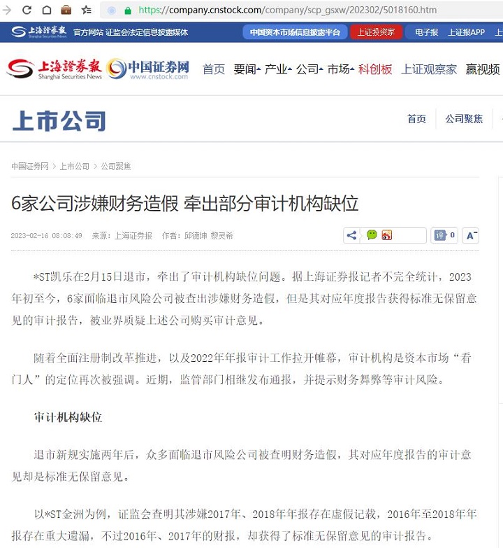 专家观点:叶小杰 | 上海证券报:6家公司涉嫌财务造假 牵出部分审计机构缺位【2023年2月16日】