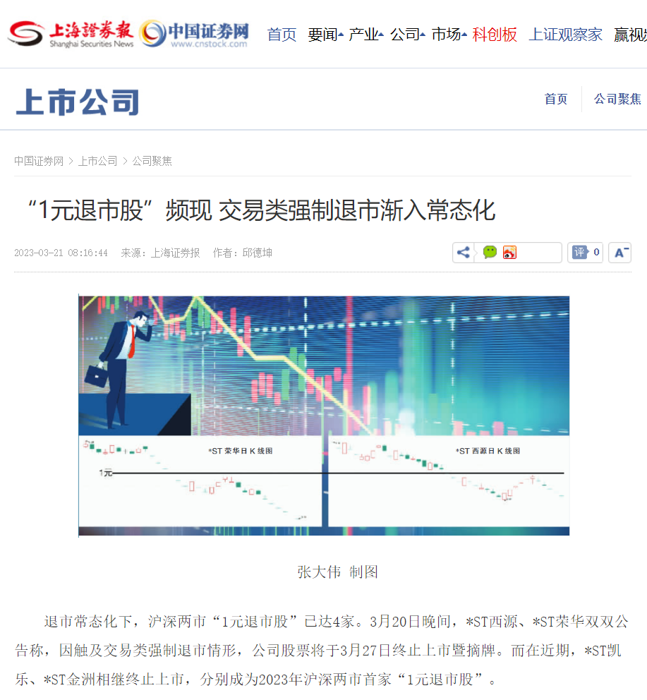 专家观点:叶小杰 | 上海证券报:“1元退市股”频现 交易类强制退市渐入常态化 【2023年3月21日】