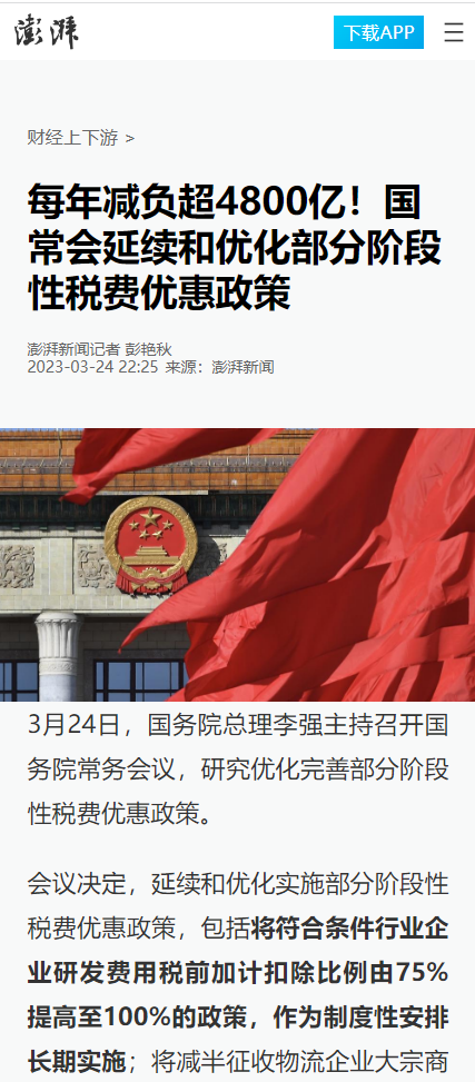 专家观点:宫映华|澎湃新闻:每年减负超4800亿!国常会延续和优化部分阶段性税费优惠政策 【2023年3月24日】