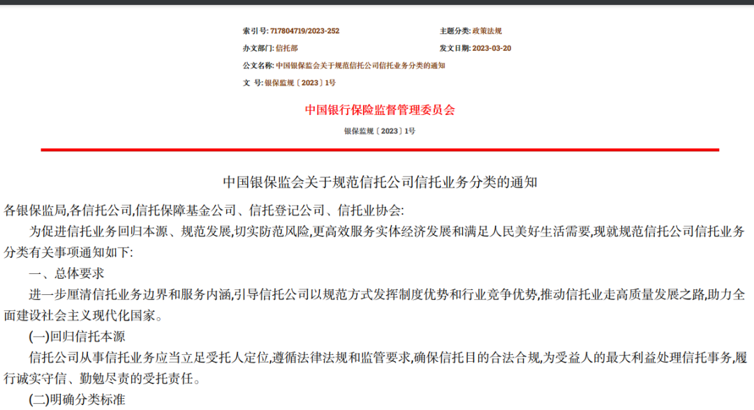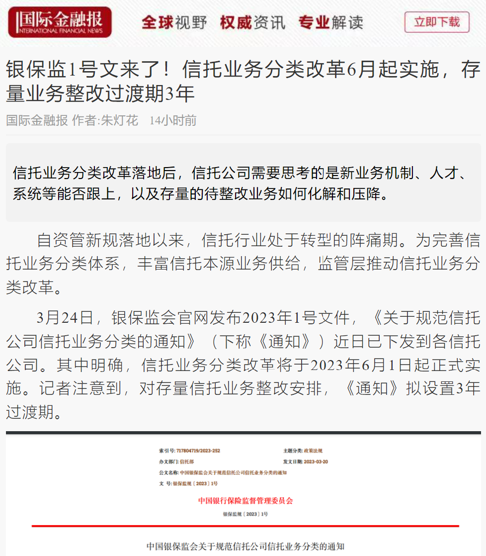 专家观点:马长峰 | 国际金融报:银保监1号文来了!信托业务分类改革6月起实施,存量业务整改过渡期3年【2023年3月25日】