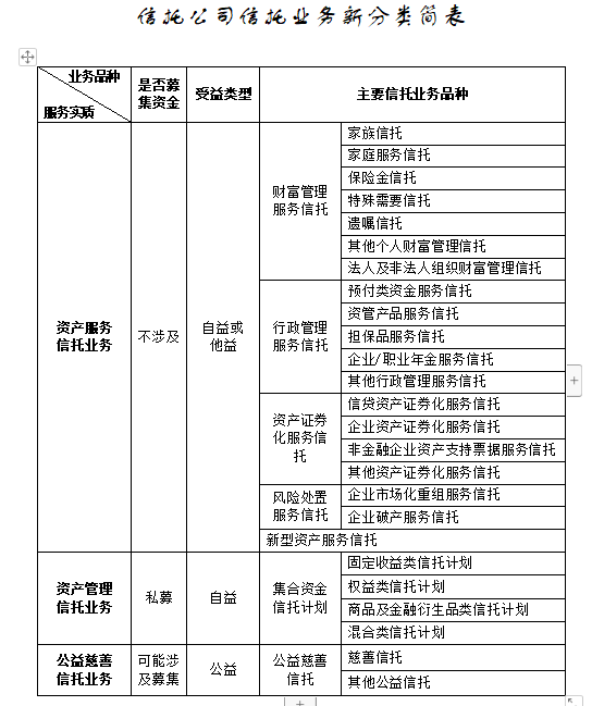 《通知》还明确了信托业务分类标准和要求,信托公司应当以信托目的、信托成立方式、信托财产管理内容为分类维度,将信托业务分为资产服务信托、资产管理信托、公益慈善信托三大类共25个业务品种。