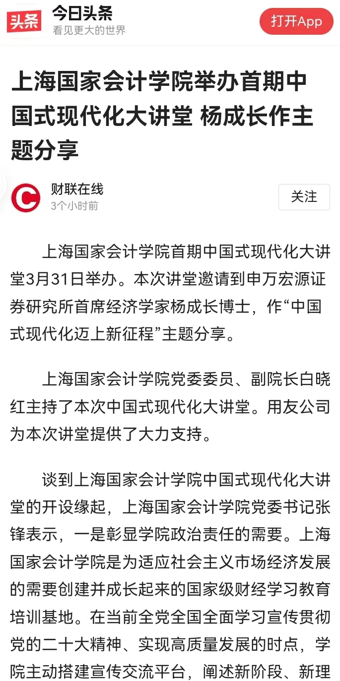财联社:上海国家会计学院举办首期中国式现代化大讲堂 杨成长作主题分享【2023年4月6日】