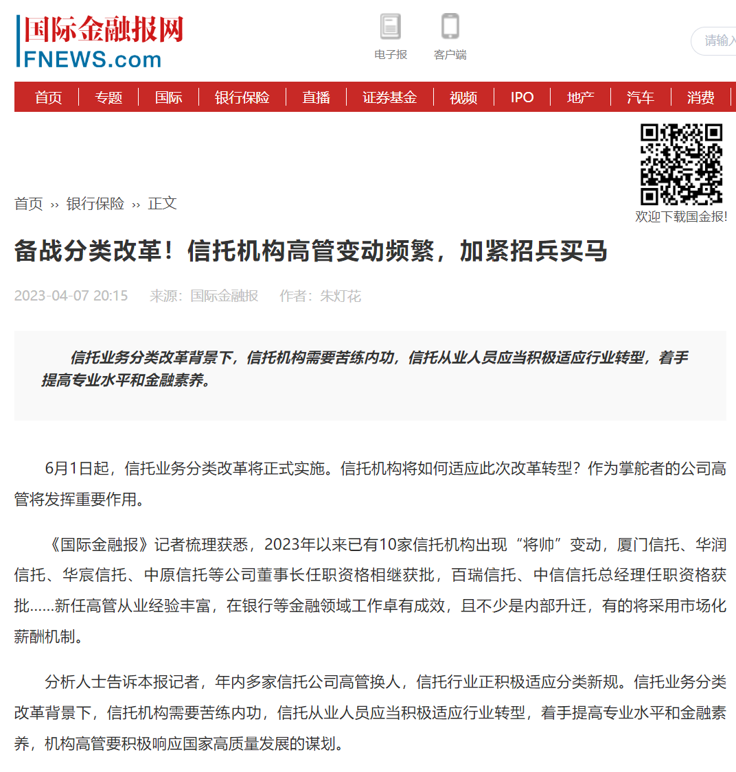 行业观点:马长峰|国际金融报:备战分类改革!信托机构高管变动频繁,加紧招兵买马【2023年4月7日】