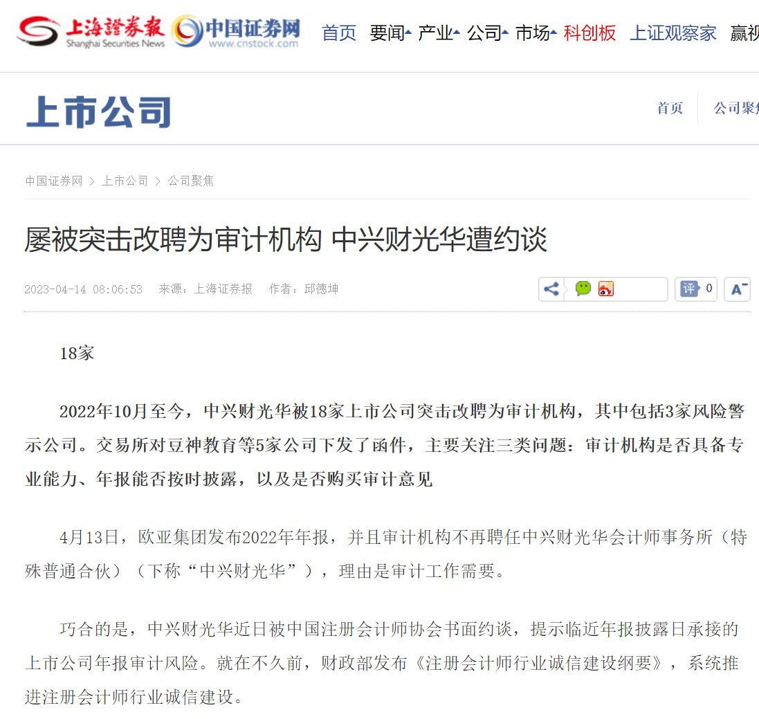 行业观点:叶小杰|上海证券报:屡被突击改聘为审计机构 中兴财光华遭约谈【2023年4月14日】