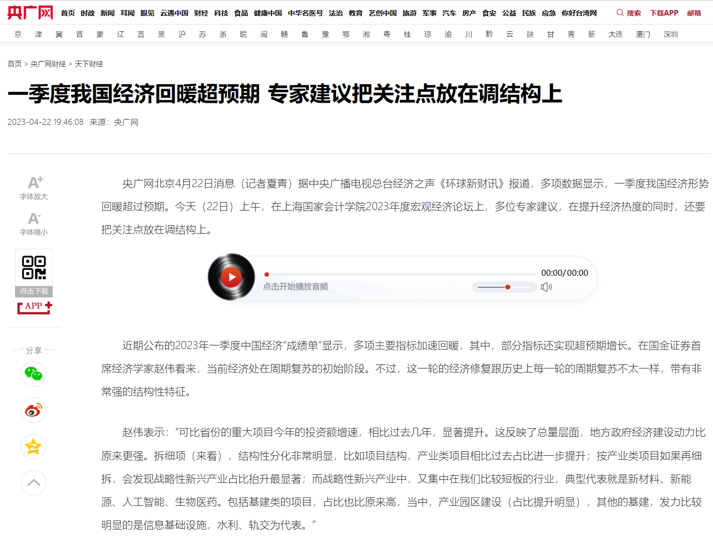 央广网:一季度我国经济回暖超预期 专家建议把关注点放在调结构上【2023年4月22日】