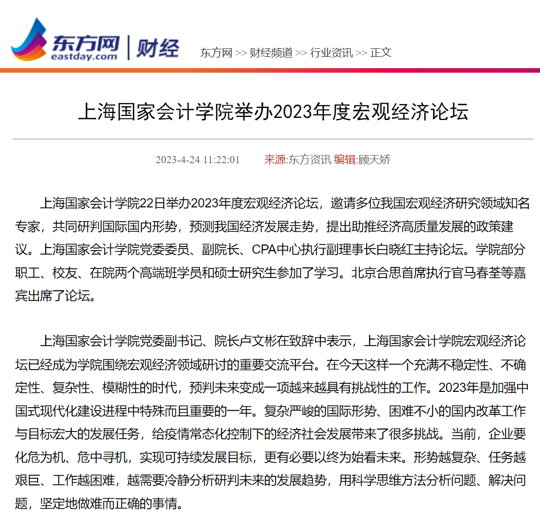 东方网:上海国家会计学院举办2023年度宏观经济论坛【2023年4月24日】