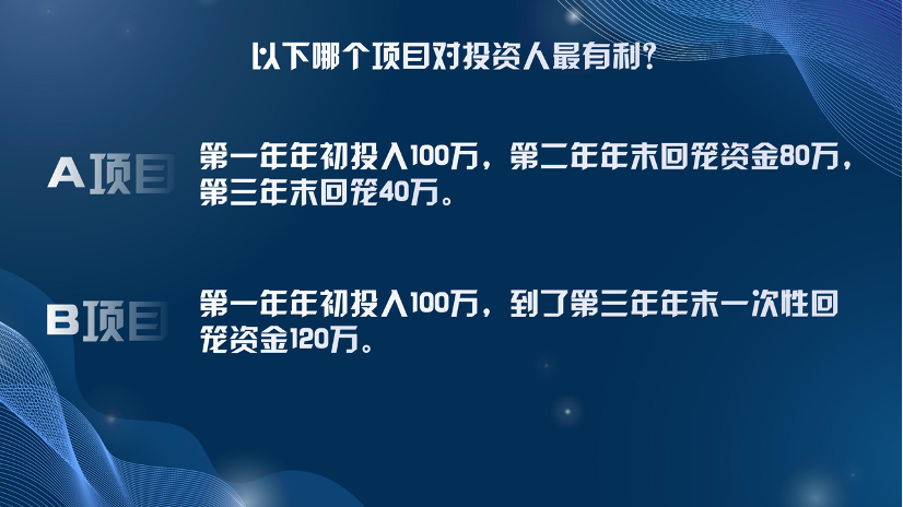 如果只考虑绝对收益率,你可能会认为这两个项目带来的回报是相同的。但是打心眼里,你又说不上来哪里不对,那各位看官,你会选择项目A?还是项目B呢?