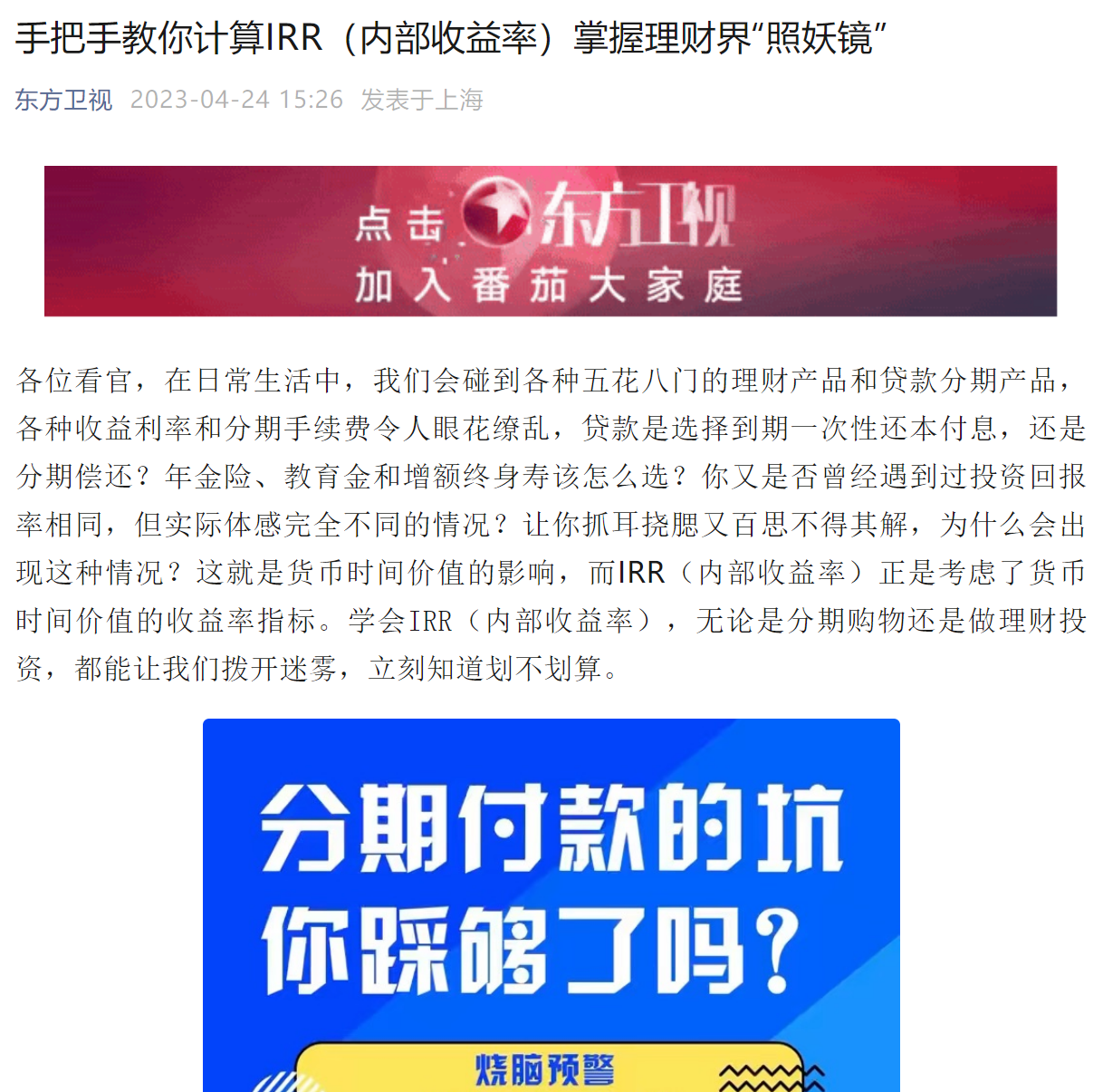 想学习更多吗?请关注东方卫视今晚22:45《来点财经范儿》,了解IRR内部收益率在你生活中最常见的两大场景。