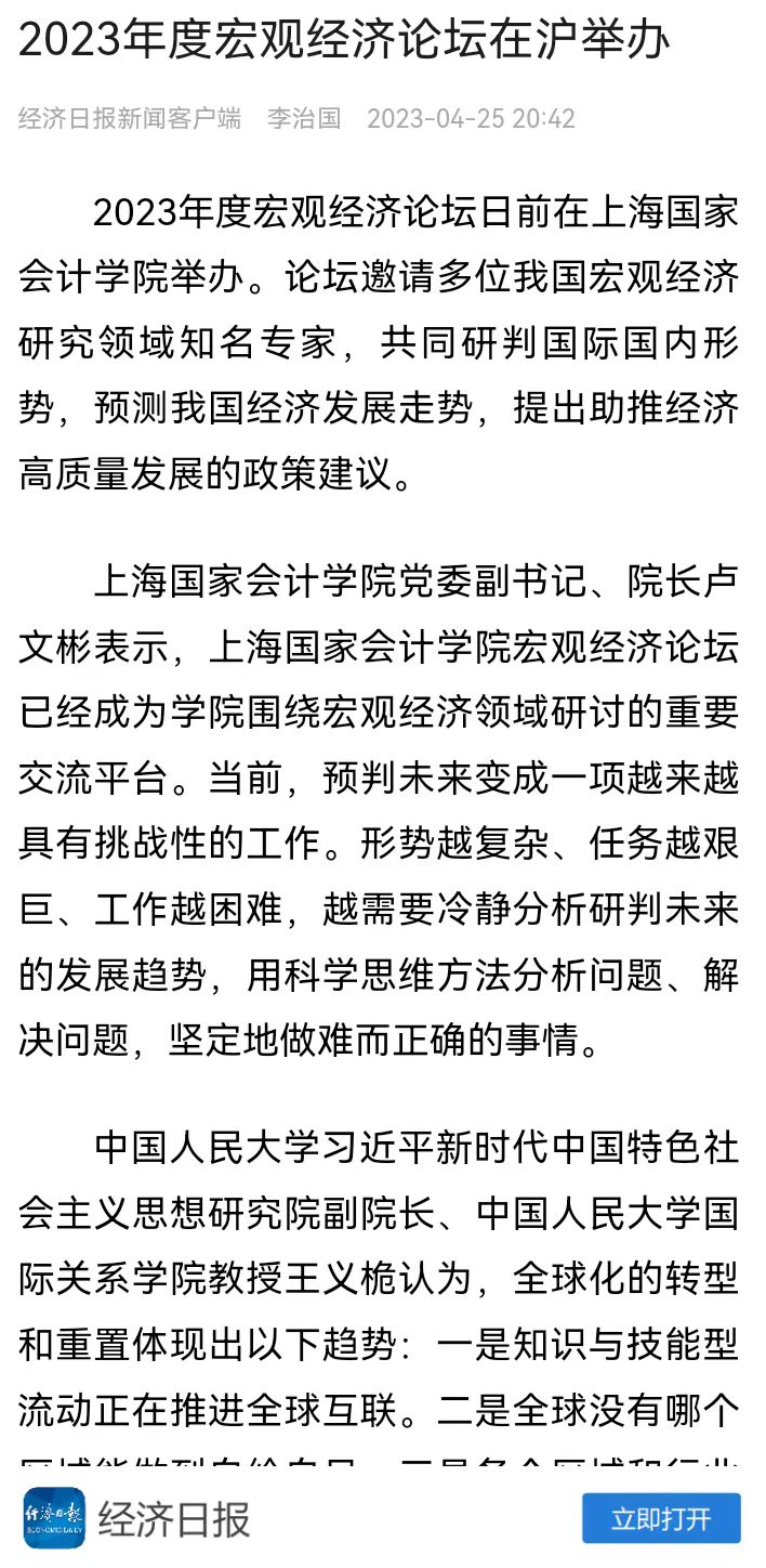《经济日报》:2023年度宏观经济论坛在沪举办【2023年4月25日】